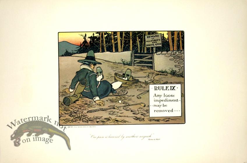 This series of lithographs were originally painted by Charles Crombie. Published in The Rules of Golf Illustrated circa 1905. Each print has a ad for Perrier water on the back. Size: 17.4 x 11.4 inches. The image is 8.6 inches wide.