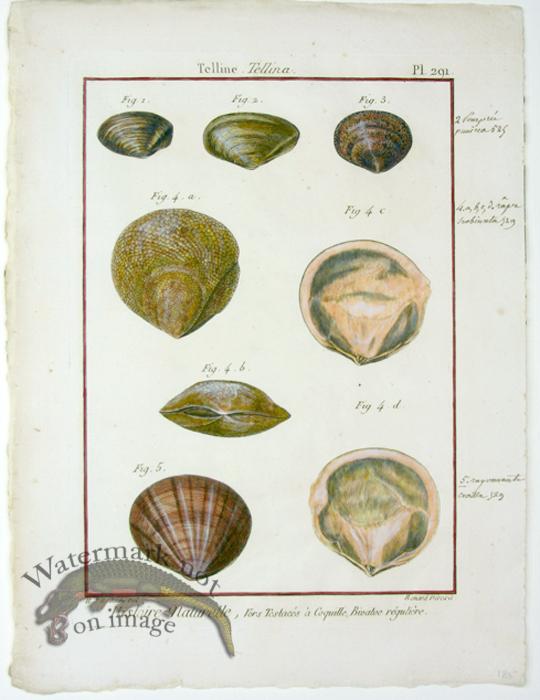 Hand colored copper plate engravings of shells from Encyclop?die ou Dictionnaire des Sciences, des Arts et des M?tiers by Denis Diderot & Jean le Rond D Alembert. Published around 1770. Most prints are engraved by H. J. Redoute, and few by other men and numbers 14 and 15 engraved by Pierre Joseph Redoute. 11.5 inches by 9.25 inches with the great edges of the paper showing.