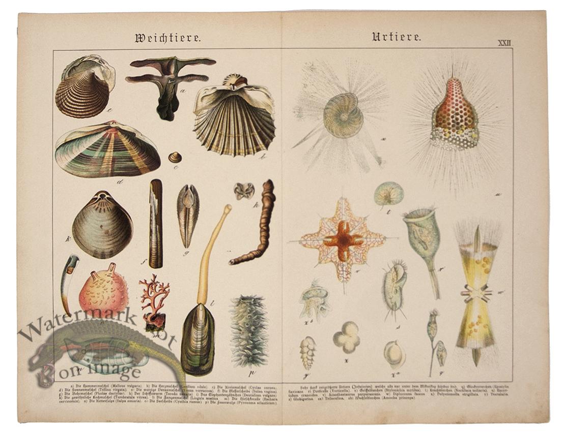 Original Antique Prints from 1886 by Gotthilf Heinrich von Schubert. Printed in German and Latin each print contains the names at the bottom of the page of the subject matter. Published in 3 Volumes (Mammals, Sea Life and Birds) this work consisted of 90 plates. Each print is a lithograph with original coloring. A centerfold runs vertically through the print and once framed is almost unseen. The prints do have aging along the edge and at the bottom as show in the picture but considering there age are in good condition. Some prints have slight separation at bottom in fold but it does not go into the image and will be behind the mat once framed. This is a clean and brightly colored set of Schubert's work and frame wonderfully. Print size is approximately 12.6 x 15.8 inches.