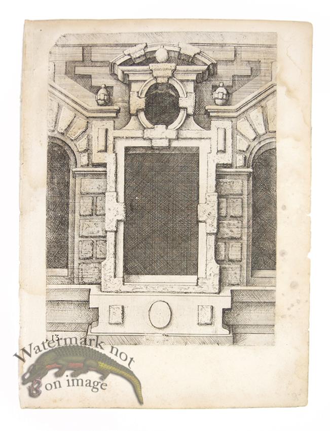 Antique prints from Architectura by Wendel Dietterlin. These copper plate engravings printed on handmade chainlaid paper were published in Strassburg in 1598. Most of his paintings are now lost, and he is best known for his treatise on architectural ornament, Architectura, published in its final edition in Nuremberg in 1598. Each print is approximately 12.25 x 9.25.