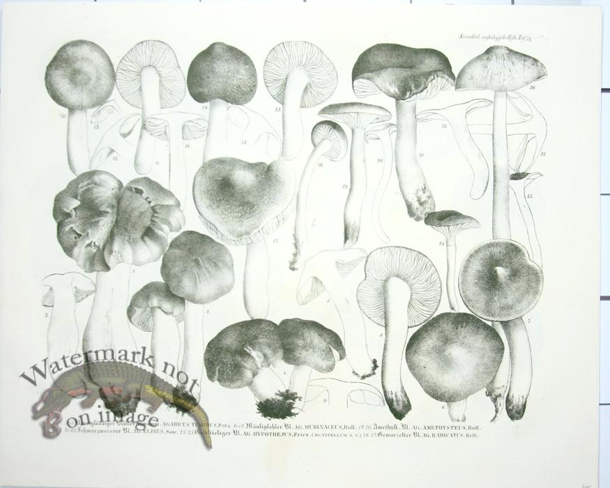Hand colored copper plate engravings from a Atlas on Mushrooms from 1860. Great large size of 17.3 inches by 14 inches. Very Rare.