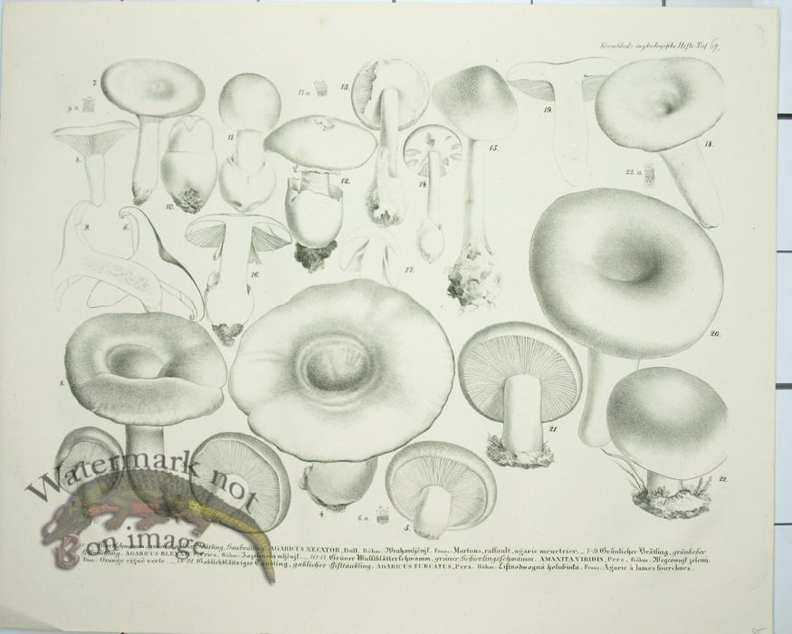 Hand colored copper plate engravings from a Atlas on Mushrooms from 1860. Great large size of 17.3 inches by 14 inches. Very Rare.