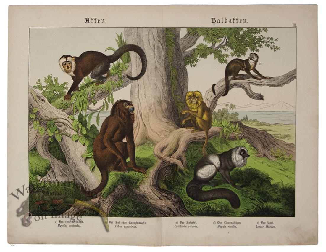 Original Antique Prints from 1886 by Gotthilf Heinrich von Schubert. Printed in German and Latin each print contains the names at the bottom of the page of the subject matter. Published in 3 Volumes (Mammals, Sea Life and Birds) this work consisted of 90 plates. Each print is a lithograph with original coloring. A centerfold runs vertically through the print and once framed is almost unseen. The prints do have aging along the edge and at the bottom as show in the picture but considering there age are in good condition. Some prints have slight separation at bottom in fold but it does not go into the image and will be behind the mat once framed. This is a clean and brightly colored set of Schubert's work and frame wonderfully. Print size is approximately 12.6 x 15.8 inches.