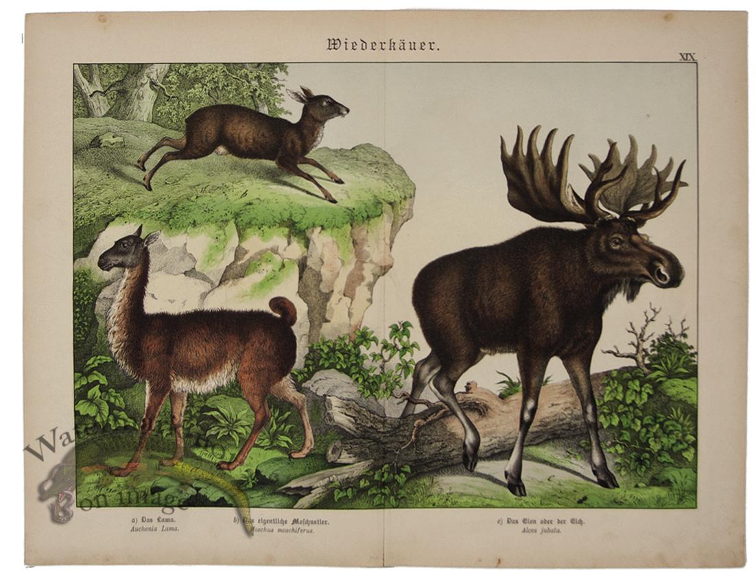 Original Antique Prints from 1886 by Gotthilf Heinrich von Schubert. Printed in German and Latin each print contains the names at the bottom of the page of the subject matter. Published in 3 Volumes (Mammals, Sea Life and Birds) this work consisted of 90 plates. Each print is a lithograph with original coloring. A centerfold runs vertically through the print and once framed is almost unseen. The prints do have aging along the edge and at the bottom as show in the picture but considering there age are in good condition. Some prints have slight separation at bottom in fold but it does not go into the image and will be behind the mat once framed. This is a clean and brightly colored set of Schubert's work and frame wonderfully. Print size is approximately 12.6 x 15.8 inches.