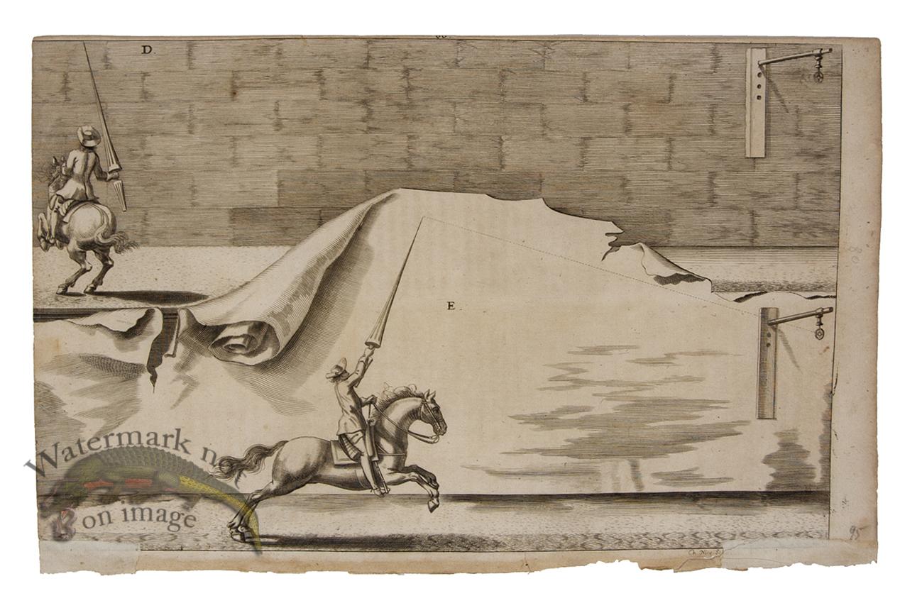 Copper plate engravings on handmade chainlaid paper, published in 1672. These are original antique prints from 'New Treatise for Breeding Horses' written by Winters, Stuterey and Reit-Schul. This is a very rare equestrian series of the training methods of horses. Size approximately 7.7 x 12.5.