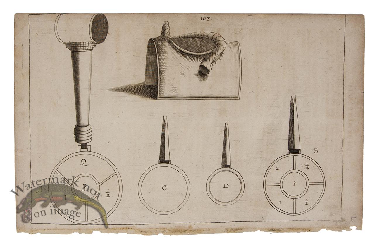 Copper plate engravings on handmade chainlaid paper, published in 1672. These are original antique prints from 'New Treatise for Breeding Horses' written by Winters, Stuterey and Reit-Schul. This is a very rare equestrian series of the training methods of horses. Size approximately 7.7 x 12.5.