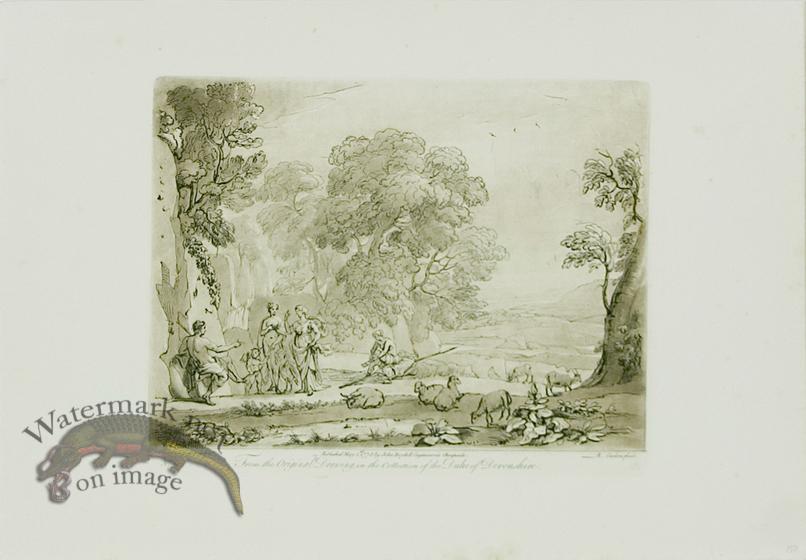 Claude Lorrain mezzotint engravings from 1813-1819. Published in a 3 volume set of books titled Liber Vertatis. This is my favorite series of landscapes they are just amazing. A mezzotint is where in order to get the watercolor wash look in these images they would cover parts of the printing plate (copper plate) with wax (where the did not want any color) and dip it in acid. The acid would burn into the plate leaving tiny little holes for ink to fall into during printing. This was repeated many more times to get the desired wash effect and then they would go back and engrave the plate. What is really great is you can actually feel the ink raise off the paper on this series. The paper is a nice heavy stock and remember we can custom frame for you. Paper size:16.5 x 11.5 inches.