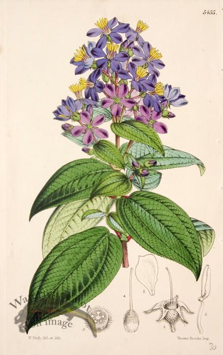 The Botanical Magazine was started by William Curtis in 1787. This publication was a monthly magazine that was mailed to subscribers. Each paper covered booklet would contain a few of these hand colored prints with information on the plant species illustrated. After years of collecting many of these magazines were bound into books. The series ran for around 160 years with over 5000 plates. The magazine ran for such a long time that as it went on the printing style changed. Earlier prints are hand colored copper plate engravings and the later prints are hand colored lithographs all with original water color. We have over 60 volumes with 4000 prints which we pulled some of the best for this collection which I am calling Curtis Botanical Magazine Small (CBMS) as there is another series of double folds that are twice the size. Print sizes vary by up to a quarter of an inch due to how they were bound. This will not be a problem when framing them as a set and remember we also do custom framing. Size: 9.375 by 6 inches.