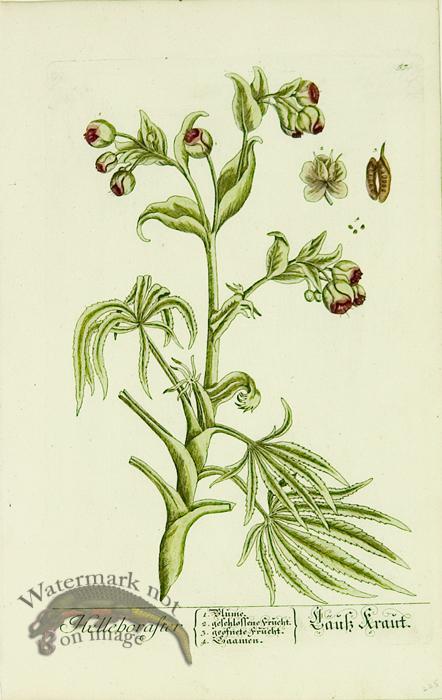 Hand colored copper plate engravings on hand made chain laid paper. Published in Germany in 1764 with all original watercolor work. Illustrated by Elisabethae Blackwell and titled Herbarium Selectum Emendatum Et Avctum Centuria. Size: 14.2 x 9.2 inches.