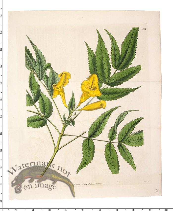 Original antique prints, hand colored engravings and lithograph prints from the William Curtis Botanical Magazine. The date on this publication spans from the 1780 through the 1890 and is even still in print today. Most prints are from the mid to late 1800s and we can give a more exact description upon request. We went through a few hundred Curtis Botanical prints to bring you the best double-folds you can find. A double-fold is a print that has been folded in half or thirds in order to fit into the size of the publication. These fold lines do not distract from the print and the size of these flowers is brilliant. Due to the fact this publication spans in time and printing type the sizes also vary slightly. When framed they will make a great set with the small size variations being of no concern. In order to place such a large volume of these prints online we have given a general size of between 10.4 to 12.4 inches by 9 to 9.5 inches. We have added a ruler onto the image so you can double check the size of these great antique flower prints.