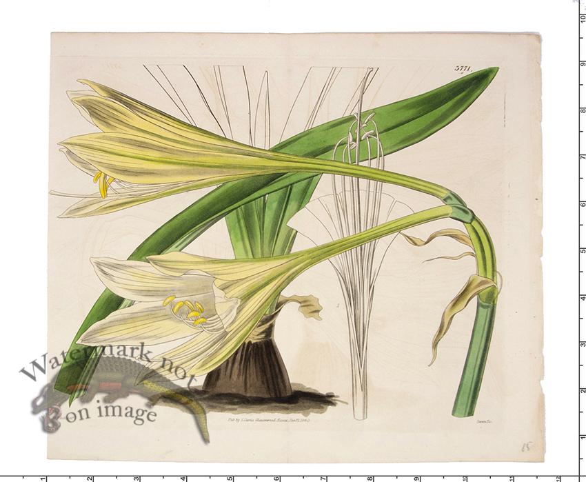 Original antique prints, hand colored engravings and lithograph prints from the William Curtis Botanical Magazine. The date on this publication spans from the 1780 through the 1890 and is even still in print today. Most prints are from the mid to late 1800s and we can give a more exact description upon request. We went through a few hundred Curtis Botanical prints to bring you the best double-folds you can find. A double-fold is a print that has been folded in half or thirds in order to fit into the size of the publication. These fold lines do not distract from the print and the size of these flowers is brilliant. Due to the fact this publication spans in time and printing type the sizes also vary slightly. When framed they will make a great set with the small size variations being of no concern. In order to place such a large volume of these prints online we have given a general size of between 10.4 to 12.4 inches by 9 to 9.5 inches. We have added a ruler onto the image so you can double check the size of these great antique flower prints.