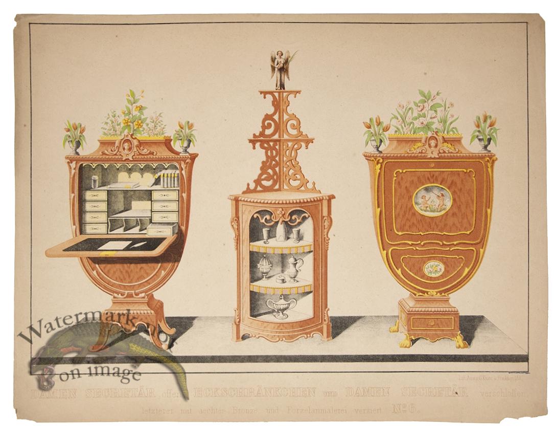 Hand colored antique lithographs printed in Frankfurt by Streng and Schneider circa 1870. Print sizes vary slightly. Please note in photograph edge chipping and any paper damage. Very beautiful color work. These prints are from a very rare furniture catalog and would make a great addition to any antique print collection. Size: 13 x 10 inches.
