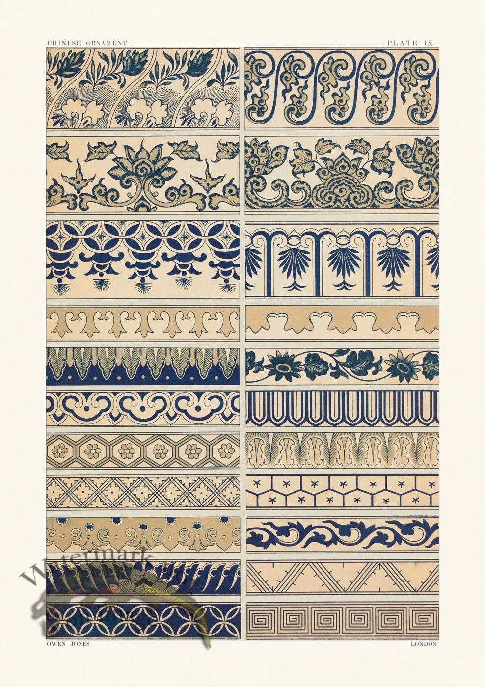 CFA Edition giclée reproduction of Plate 15 from Examples of Chinese Ornament by Owen Jones, originally published in London, England in 1867. This piece is printed on acid-free cotton rag paper using archival inks for exceptional quality and longevity.