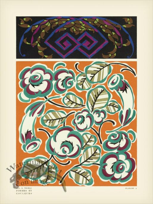 CFA Edition giclée reproduction from Formes et couleurs: vingt planches en couleurs contenant soixante-sept motifs décoratifs by Auguste H. Thomas, originally published in Paris by A. Levy (Librairie Centrale des Beaux-Arts) in 1921. This Art Deco–era portfolio is known for its bold decorative motifs and vibrant colorwork (the original plates were produced using the pochoir stencil process). These beautifully done giclee reproductions are printed on acid-free cotton rag paper with archival inks for exceptional quality and longevity.