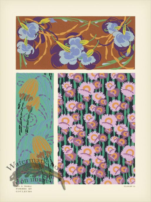 CFA Edition giclée reproduction from Formes et couleurs: vingt planches en couleurs contenant soixante-sept motifs décoratifs by Auguste H. Thomas, originally published in Paris by A. Levy (Librairie Centrale des Beaux-Arts) in 1921. This Art Deco–era portfolio is known for its bold decorative motifs and vibrant colorwork (the original plates were produced using the pochoir stencil process). These beautifully done giclee reproductions are printed on acid-free cotton rag paper with archival inks for exceptional quality and longevity.