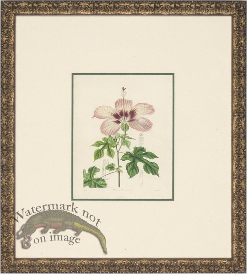 Hand colored engraving of hibiscus botanical by Maund circa 1825. Framed in an ornate Italian gold molding The matting is acid free cotton rag with the top mat of off white and the bottom of green. Framed at 16.2 inches wide by 17.75 inches high.