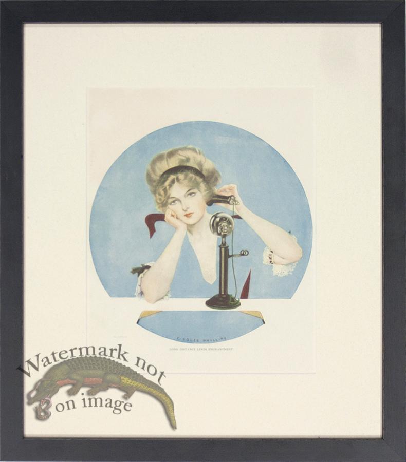 Cole Phillips Long Distance Lends Enchantment illustration from A Young Mans Fancy or Gallery of Girls published in 1912 and 1911. Framed in a acid free cotton rag mat board with a black Italian moulding. The outer dimensions are approximately 14.75 inches by 16.75 inches.