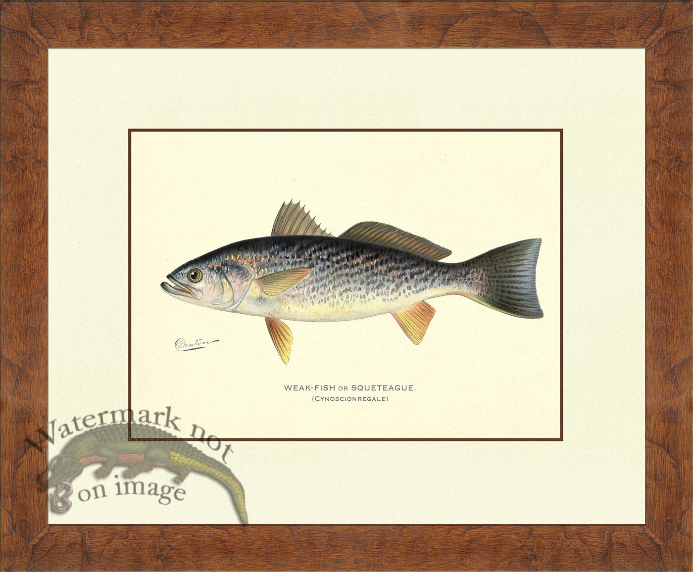 Gicee reproductions of Denton's Fish from the Forest Fish and Game of New York from the 1890s to around 1907. We have also added a few fish to the set for the perfect catch. If you don't see the fish you are fishing for contact us. Printed on acid free cotton rag paper with archival inks. This is our new and improved set with a new size and a great aged background and deeper colors to give the print an aged yet beautiful look. Size 12x16 inches. The print will also fit a 16x20 inch frame with a 3 inch mat.