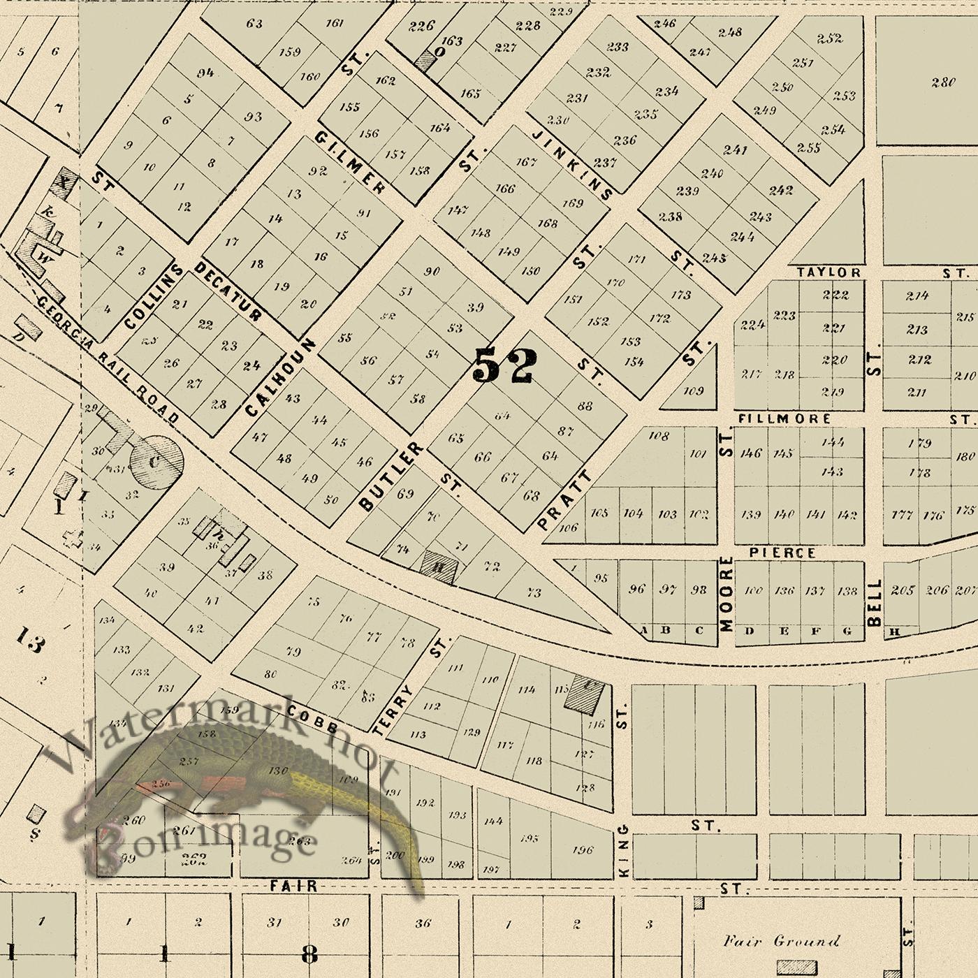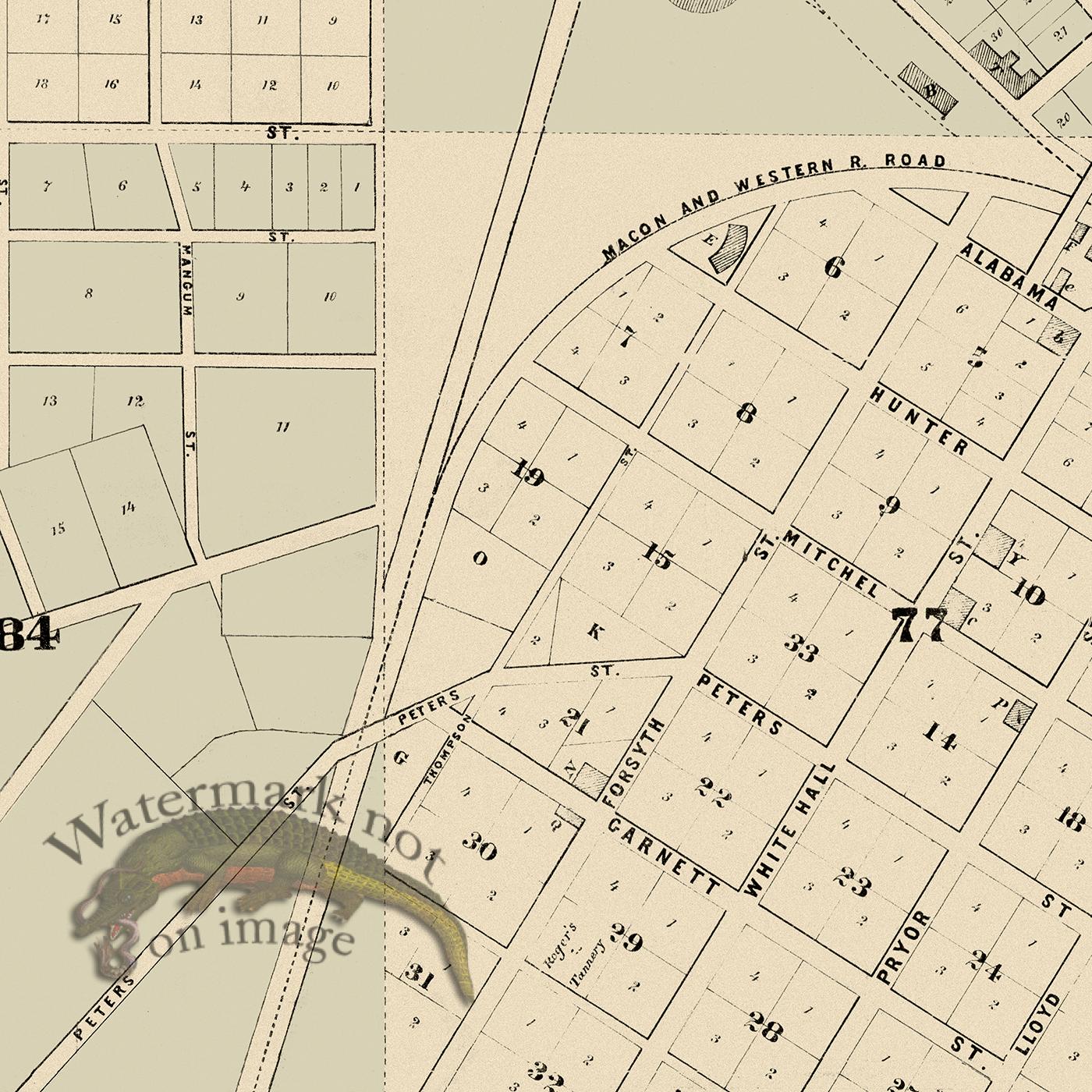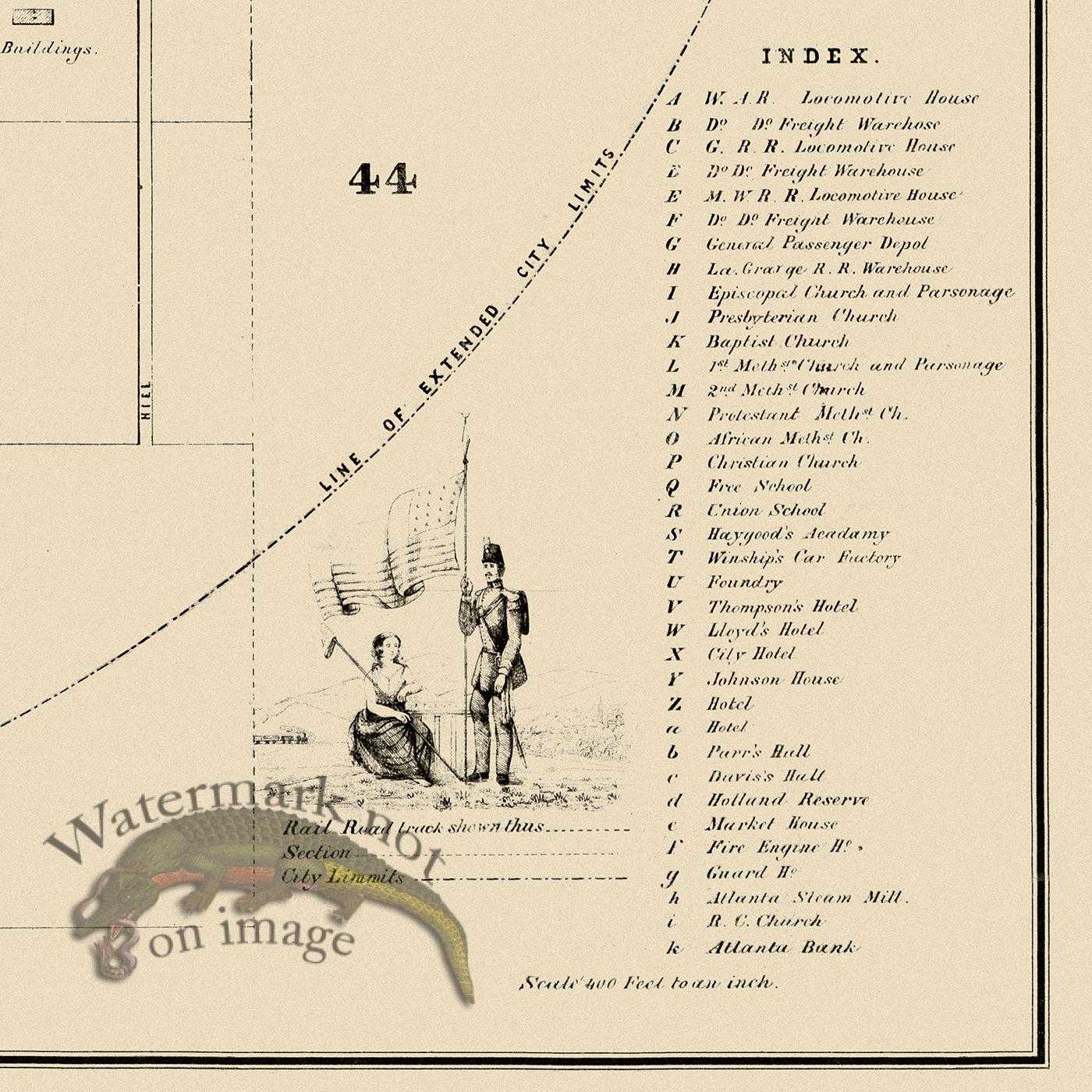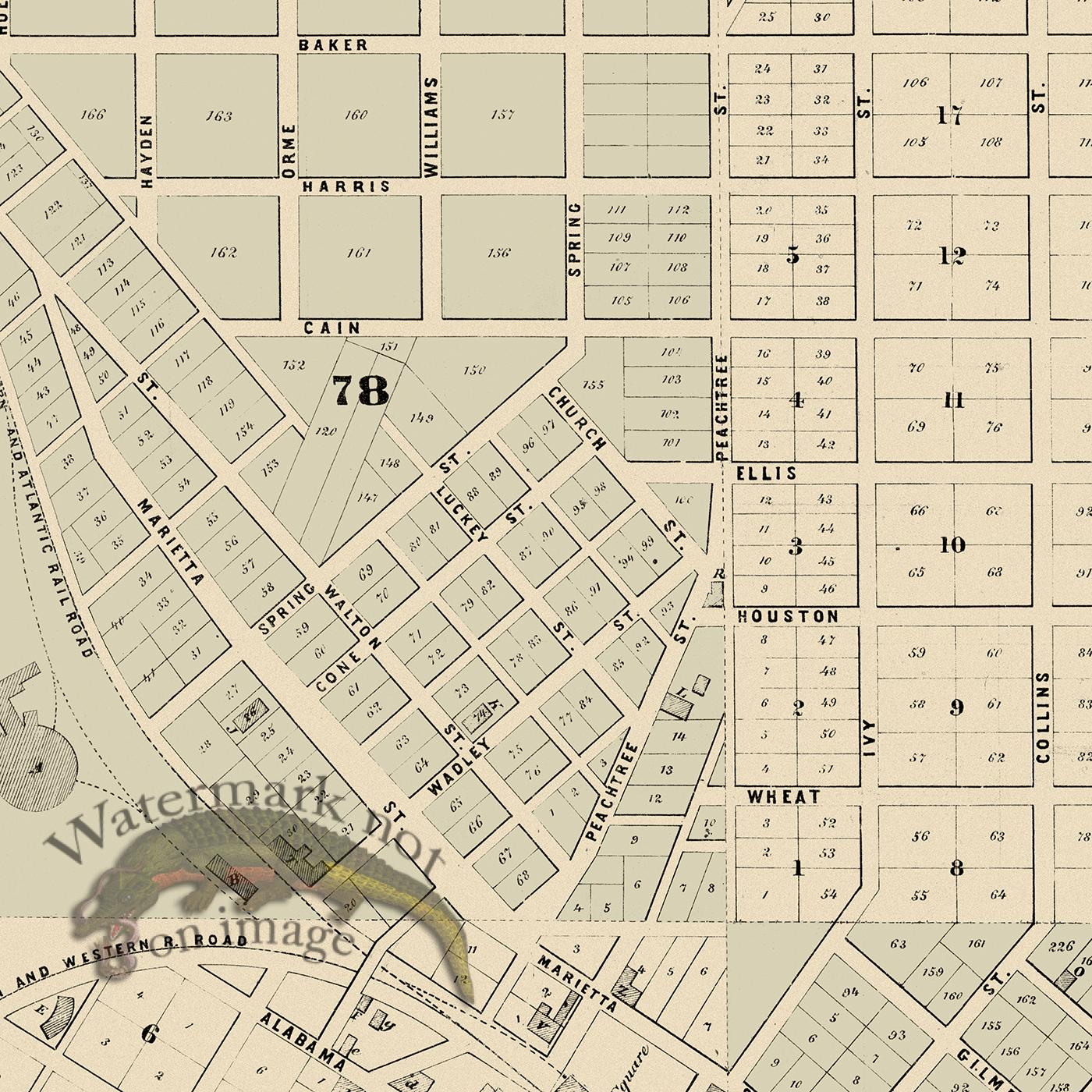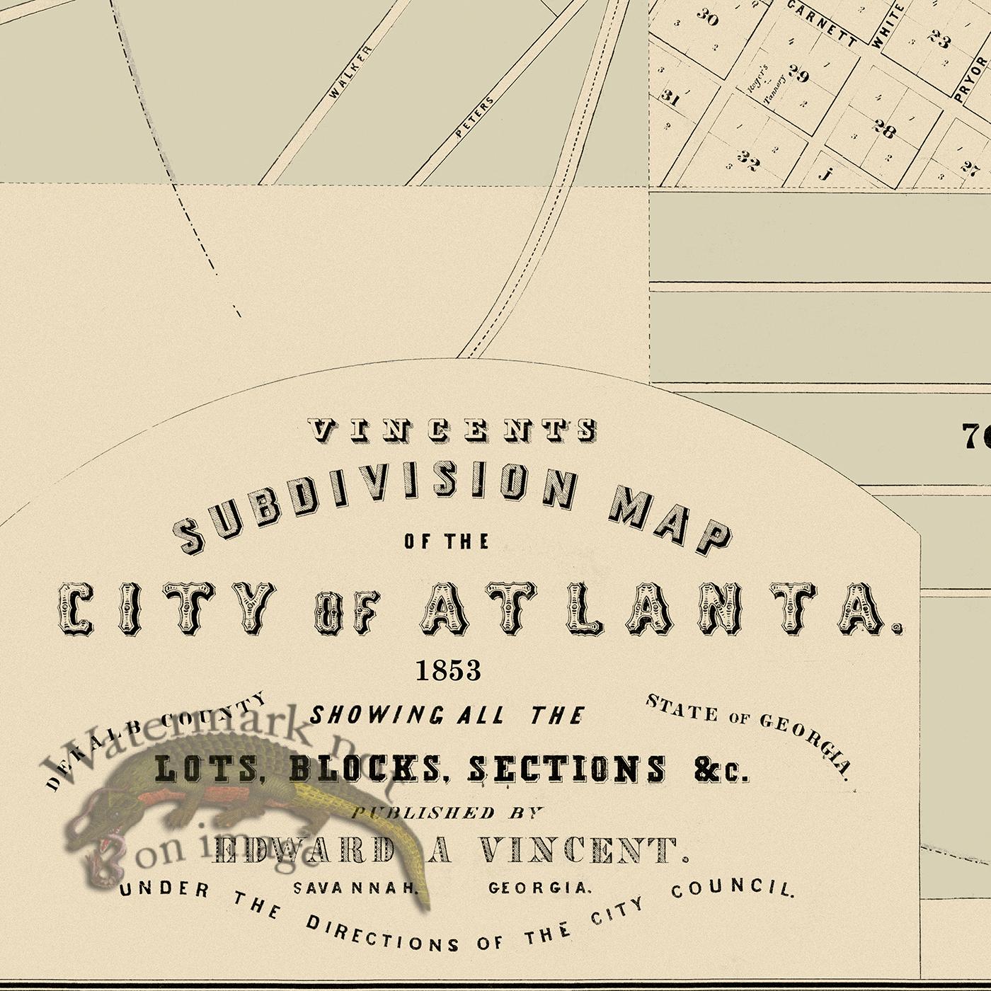 Giclee reproduction of an awesome early pre civil war map of Atlanta. Titled Vincent's Subdivision Map of the City of Atlanta Showing all the Lots, Blocks, Sections &c. Published by Edward A Vincent Savannah Georgia. This is a super rare map and we are excited to finally have it to reproduce. It is printed on acid free cotton rag paper with archival inks. The map is for sale here at  24x24 inches though if you need it larger or smaller or a diffrent color contact us.