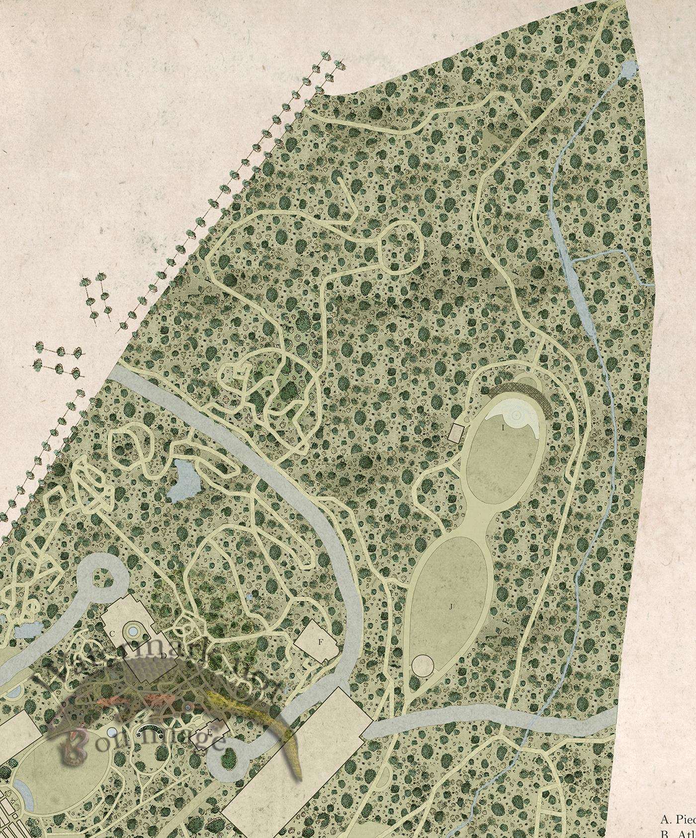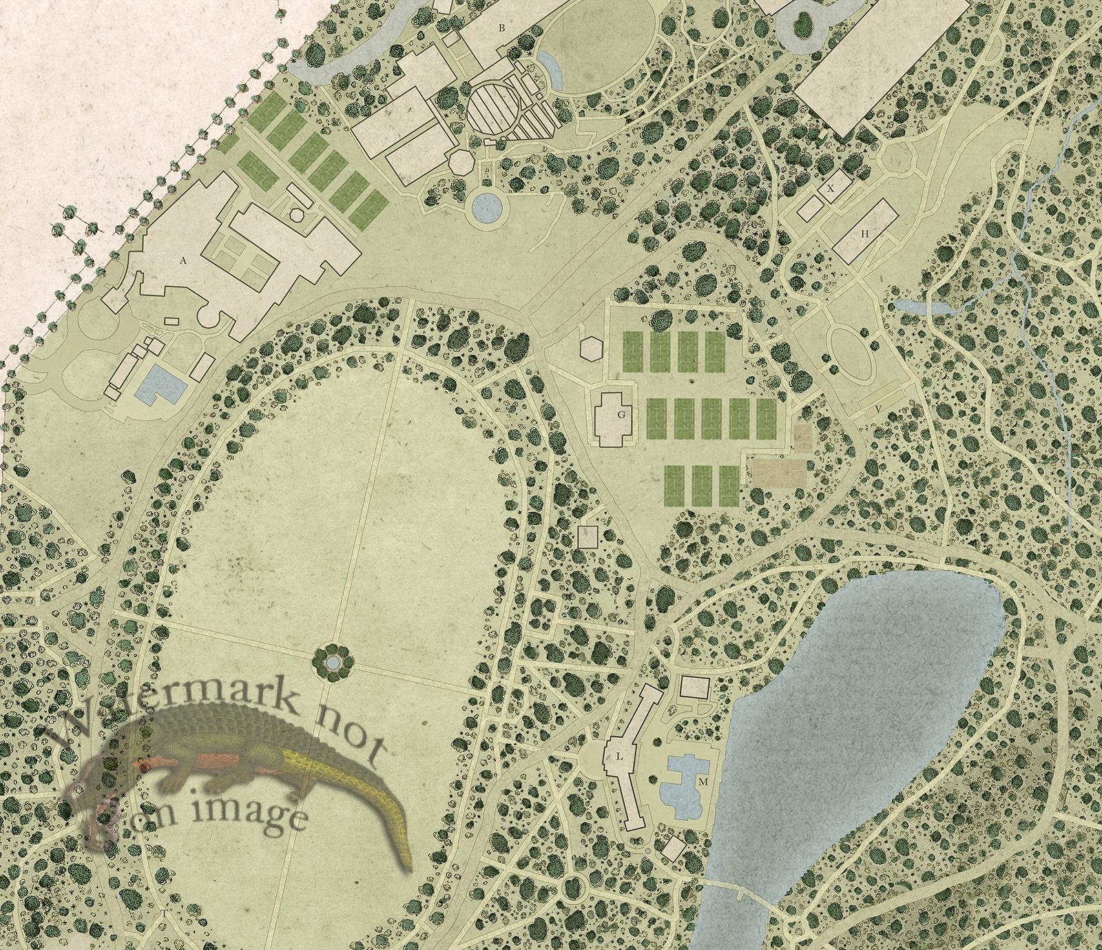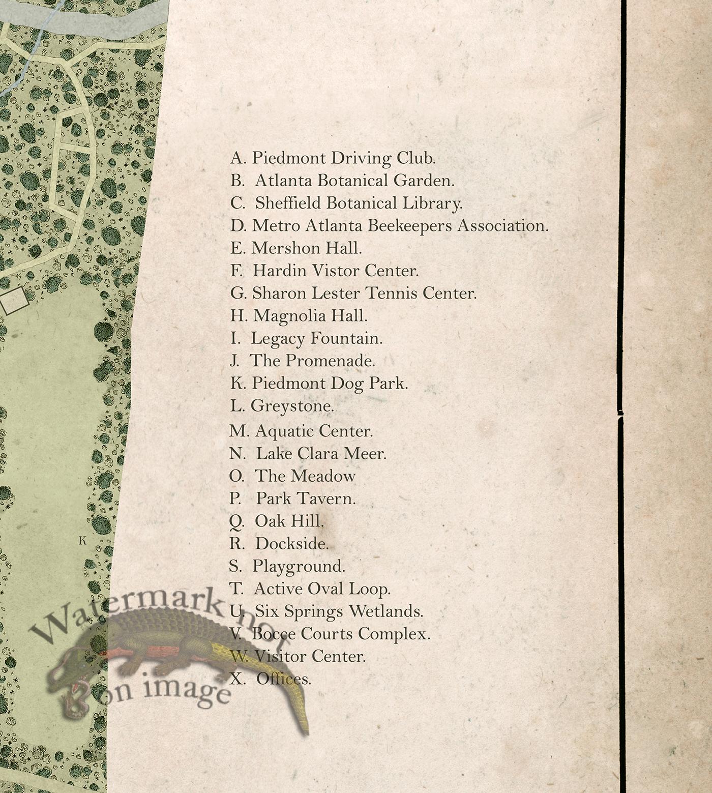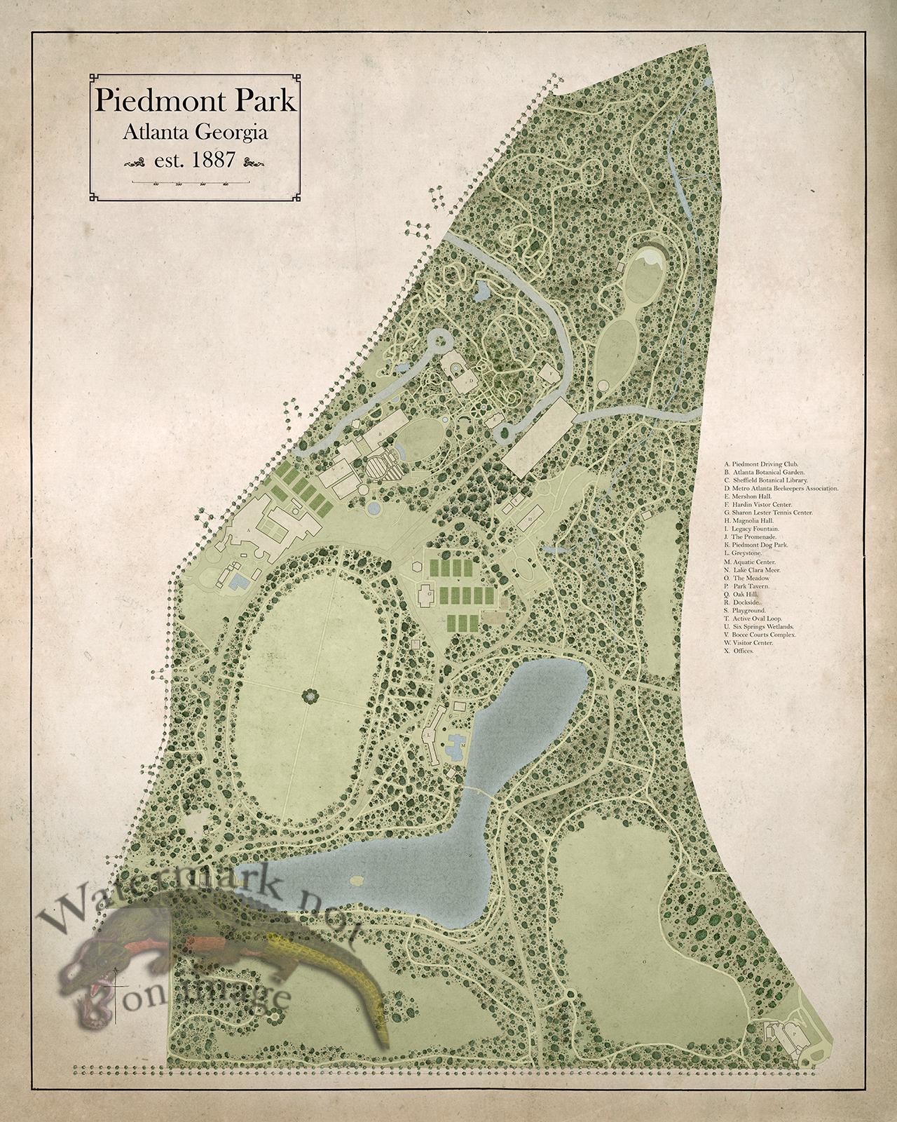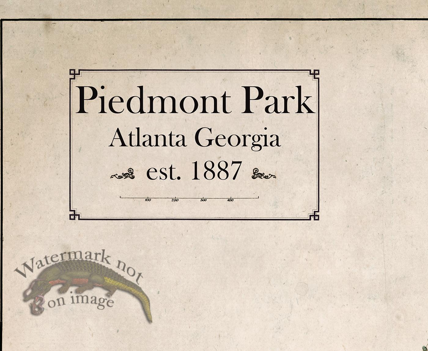 Our rendering of an antique map of Piedmont Park in Atlanta. We made this map as requested by a customer. It has most of the trails and buildings that now are present in the park but with a vintage style. We call this Piedmont Park Map Vertical as we have made a few diffrent designs. The map is 32 x 40 inches. You can have customization done to this map and if you are interested in that service please contact us.