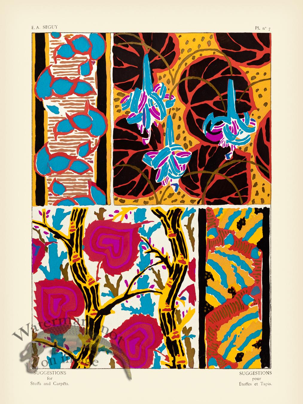 Giclée reproductions of Suggestions pour étoffes et tapis (Suggestions for fabrics and rugs) by E.A. Seguy. This work contained 20 colour pochoir lithograph plates; one of the great Art Deco portfolios, regarded as one of Séguy's most handsome works.