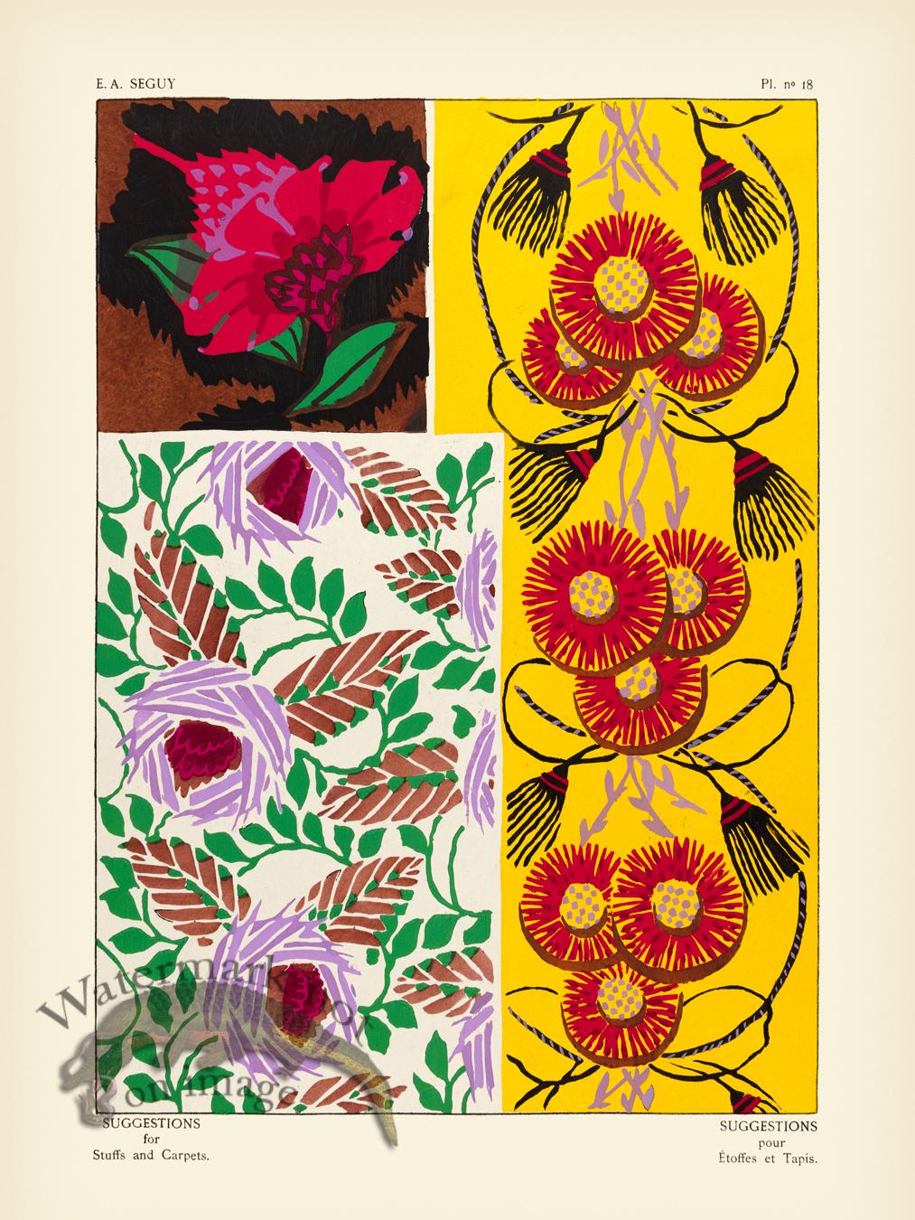 Giclée reproductions of Suggestions pour étoffes et tapis (Suggestions for fabrics and rugs) by E.A. Seguy. This work contained 20 colour pochoir lithograph plates; one of the great Art Deco portfolios, regarded as one of Séguy's most handsome works.