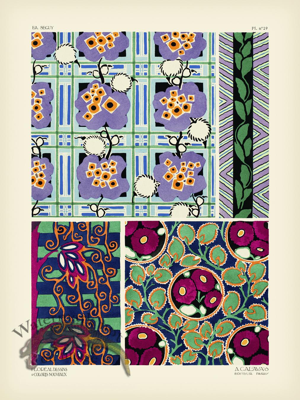 Giclée reproductions of  "Floréal: Dessins & Coloris Nouveaux" (Floreal: New Designs and Colors), created by Emile-Allain Séguy and published in Paris by A. Calavas in 1925 . This album contains 20 plates featuring semi-abstract motifs inspired by flowers, which were likely intended for use in textile and wallpaper designs. The designs are executed in bold colors and blend elements of Art Nouveau and Art Deco styles. Through these illustrations, Séguy's fascination with the natural world as a source of artistic inspiration is evident. The use of the pochoir printing technique, popular in France at the turn of the 20th century, allowed for the vibrant colors of nature to be accurately captured.