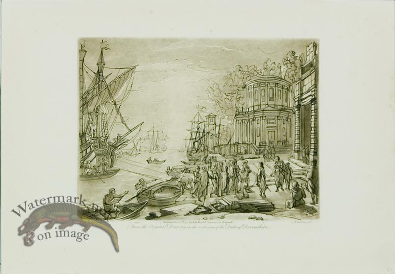 Claude Lorrain mezzotint engravings from 1813-1819. Published in a 3 volume set of books titled Liber Vertatis. This is my favorite series of landscapes they are just amazing. A mezzotint is where in order to get the watercolor wash look in these images they would cover parts of the printing plate (copper plate) with wax (where the did not want any color) and dip it in acid. The acid would burn into the plate leaving tiny little holes for ink to fall into during printing. This was repeated many more times to get the desired wash effect and then they would go back and engrave the plate. What is really great is you can actually feel the ink raise off the paper on this series. The paper is a nice heavy stock and remember we can custom frame for you. Paper size:16.5 x 11.5 inches.