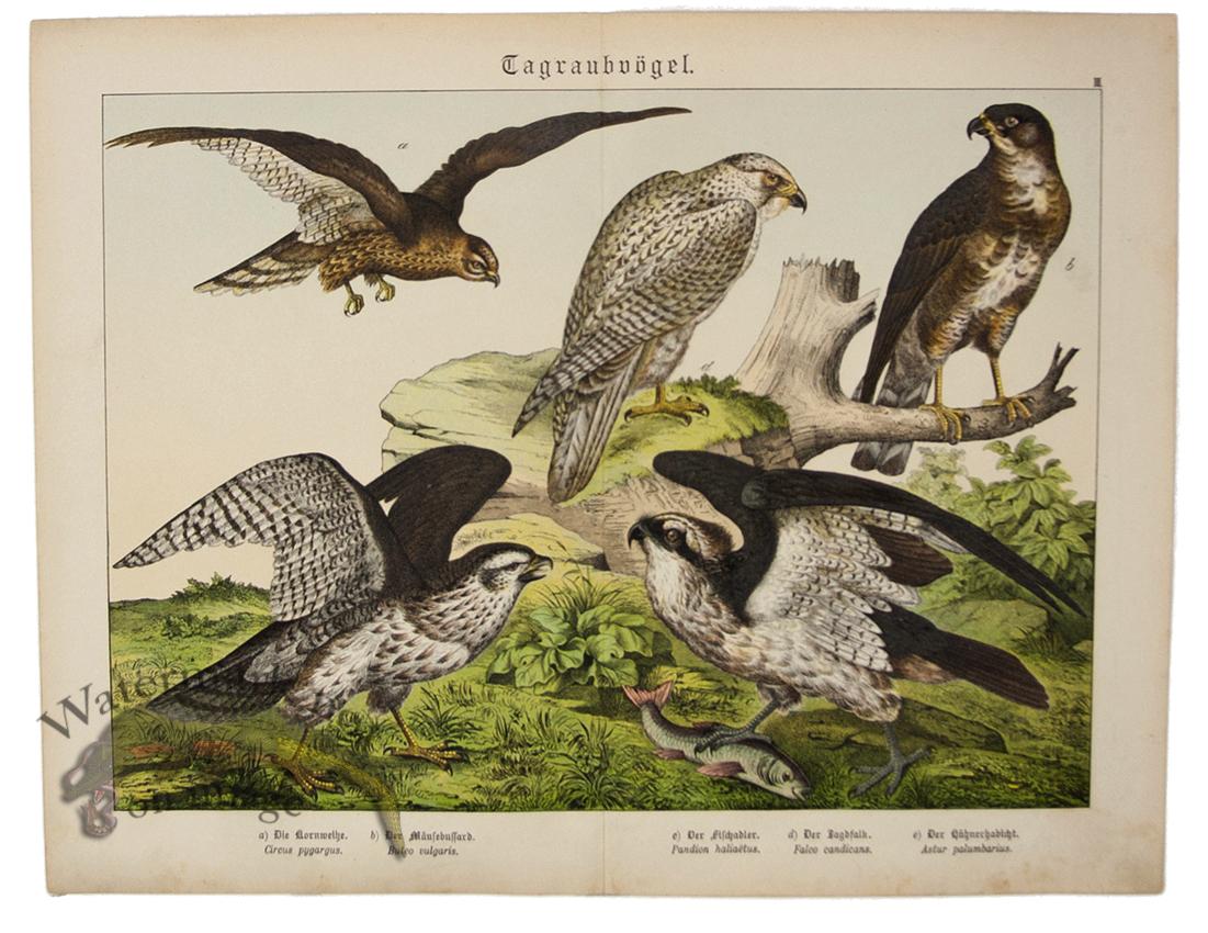 Original Antique Prints from 1886 by Gotthilf Heinrich von Schubert. Printed in German and Latin each print contains the names at the bottom of the page of the subject matter. Published in 3 Volumes (Mammals, Sea Life and Birds) this work consisted of 90 plates. Each print is a lithograph with original coloring. A centerfold runs vertically through the print and once framed is almost unseen. The prints do have aging along the edge and at the bottom as show in the picture but considering there age are in good condition. Some prints have slight separation at bottom in fold but it does not go into the image and will be behind the mat once framed. This is a clean and brightly colored set of Schubert's work and frame wonderfully. Print size is approximately 12.6 x 15.8 inches.