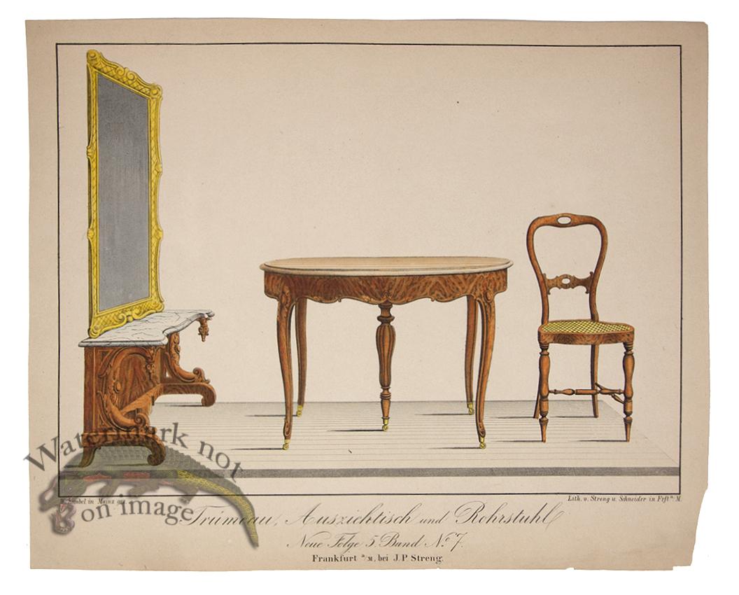 Hand colored antique lithographs printed in Frankfurt by Streng and Schneider circa 1870. Print sizes vary slightly. Please note in photograph edge chipping and any paper damage. Very beautiful color work. These prints are from a very rare furniture catalog and would make a great addition to any antique print collection. Size: 9.8 x 12.3 inches.