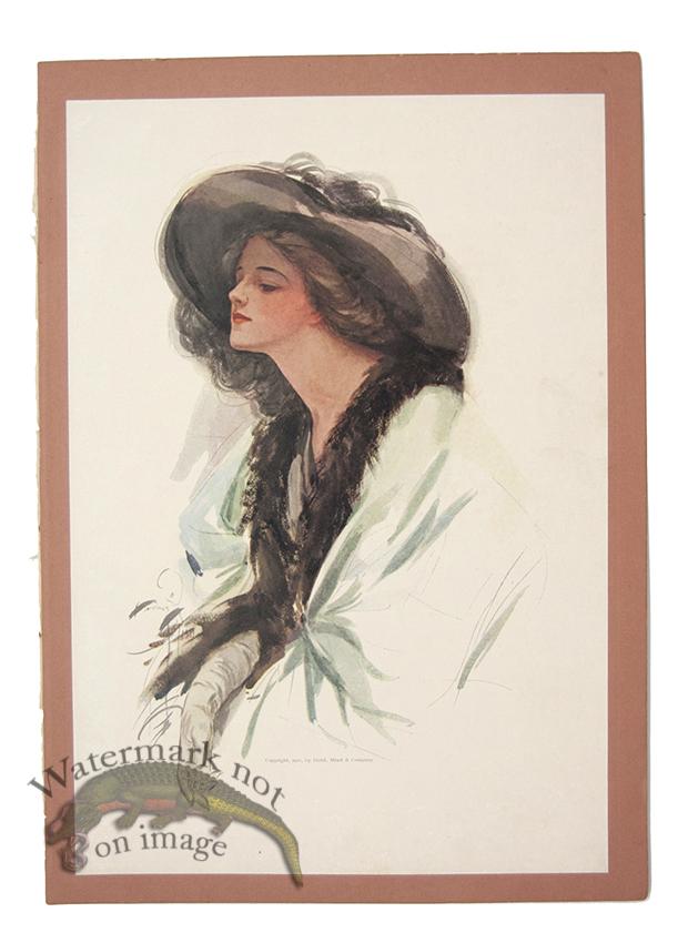 Original antique lithograph print by Harrison Fisher from American Belles. Published in New York by Dodd Mead & Company 1911. Each print is attached to a heavy stock paper as originally produced by the publisher. Prints are in good condition with aging and some spotting with varying paper color as seen in photographs. The print(white paper) is 11.75 x 6.75 and the full sheet(dark pink) is 7.75 x 12.9 inches.