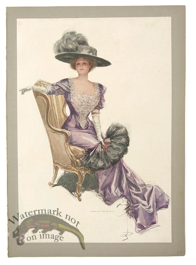 Original antique lithograph print by Harrison Fisher from A Garden of Girls. Published in New York by Dodd Mead & Company 1910. Each print is attached to a heavy stock paper as originally produced by the publisher. Prints are in good condition with aging and some spotting with varying paper color as seen in photographs. The print(white paper) is 11.75 x 6.75 and the full sheet(gray) is 7.75 x 13 inches.