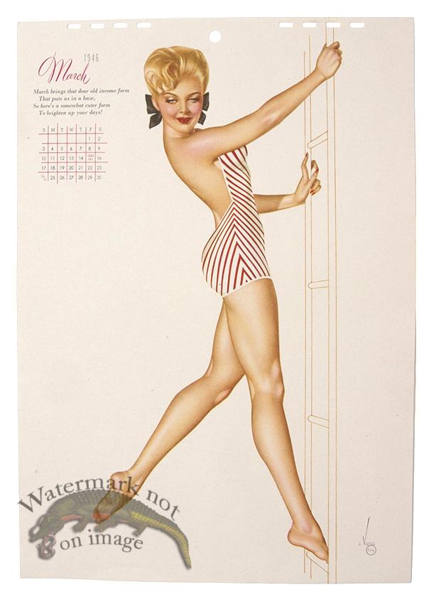 Original vintage pin-up lithographs from Esquire Magazine calendars from the 1940s by Alberta Varga (Alberta Vargas). The top of the calendar page will have holes from binding. Let us know if you need any tips on framing or if you would like us to frame these classic pin-ups for you. Print size is approximately 12 x 8.5 inches.