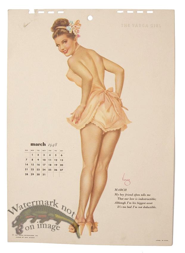 Original vintage pin-up lithographs from Esquire Magazine calendars from the 1940s by Alberta Varga (Alberta Vargas). The top of the calendar page will have holes from binding. Let us know if you need any tips on framing or if you would like us to frame these classic pin-ups for you. Print size is approximately 12 x 8.5 inches.