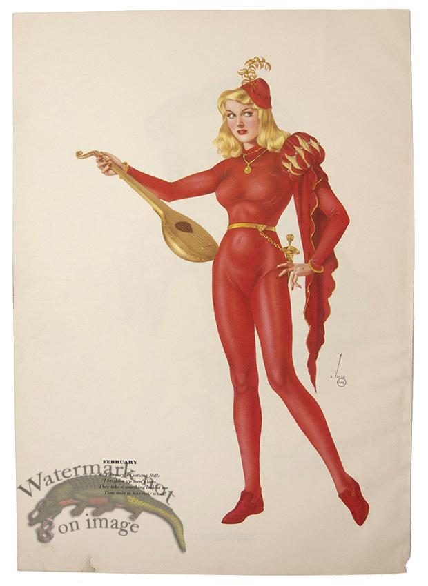 Original vintage pin-up lithographs from Esquire Magazine from the 1940s by Alberta Varga (Alberta Vargas). This is a preview page out of the magazine that will have the adjacent month on the back though we did not put that image online. In this series the days of the month are not added. Print size is approximately 10 x 14 inches.