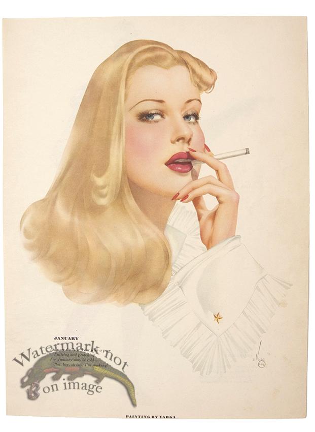Original vintage pin-up lithographs from Esquire Magazine from the 1940s by Alberta Varga (Alberta Vargas). This is a preview page out of the magazine that will have the adjacent month on the back though we did not put that image online. In this series the days of the month are not added. Print has been trimmed and the size is approximately 9 x 12 inches.