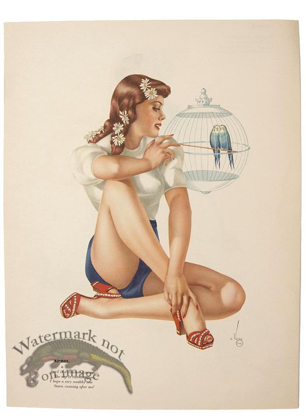 Original vintage pin-up lithographs from Esquire Magazine from the 1940s by Alberta Varga (Alberta Vargas). This is a preview page out of the magazine that will have the adjacent month on the back though we did not put that image online. In this series the days of the month are not added. Print has been trimmed and the size is approximately 9 x 12 inches.